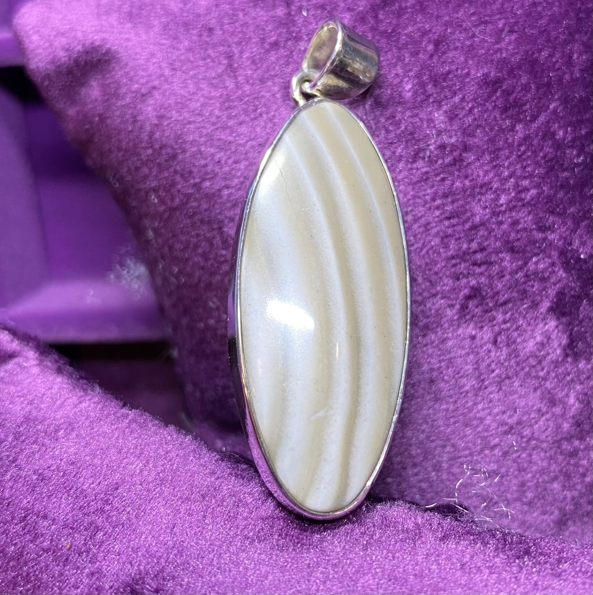 Sterling silver Flint Stone pendant, with the most beautiful natural colour markings. This is a sizeable piece; approx 4cm x 1.5cm. There is NO chain with this item. This will be boxed.